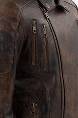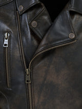 The stylish and eye-catching ROCCOBAN leather jacket CHESTER is crafted from luxurious, waxed Full Grain Nappa lambskin leather in a distressed look. It nods to the true authenticity of iconic vintage biker jackets. Its distinctive features such as an asymmetrical zipper, quilted sections, and vertical zipper pockets give this authentic piece a sporty touch – its antique brass hardware gives it its own unique, distinctive character.
