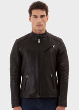 Logan Black Pearl Men's Regular-Fit Racer Leather Jacket made of high-quality grained Full-Grain lambskin leather with zipper and snap button closure